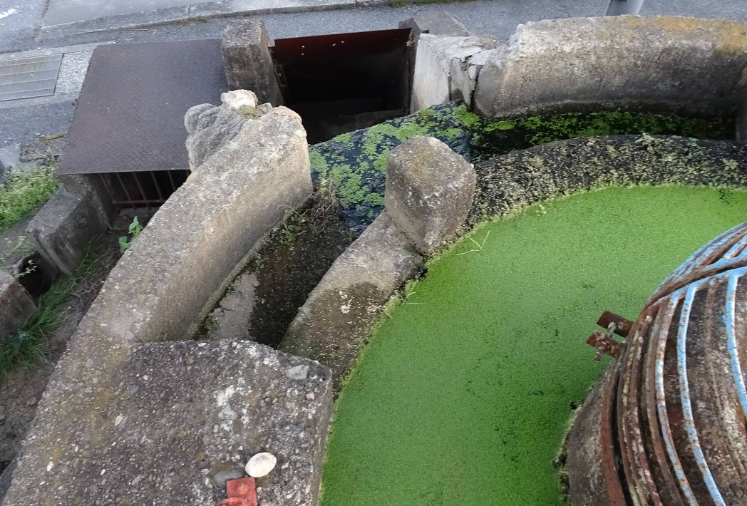 中央部の出水部分には、ゴミや落ち葉などが入らないようにドーム型のフードが付いている他、年季が入っているものの機能的な美しい設計となっている。