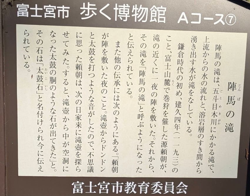 [言い伝え・概要] 五斗目木川(ごとめきがわ)にかかる素朴で美しいこの滝は、源頼朝は富士の巻狩りで近くに陣を張ったことから「陣馬の滝」と呼ばれ、毎年8月下旬には、地元有志による「陣馬の滝まつり」が開催される。