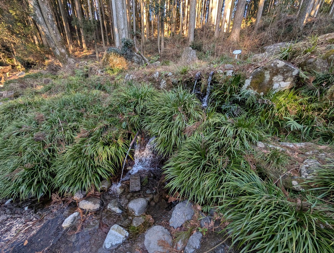 滝つぼ手前に差し込まれたパイプから湧水が湧き出ている。
