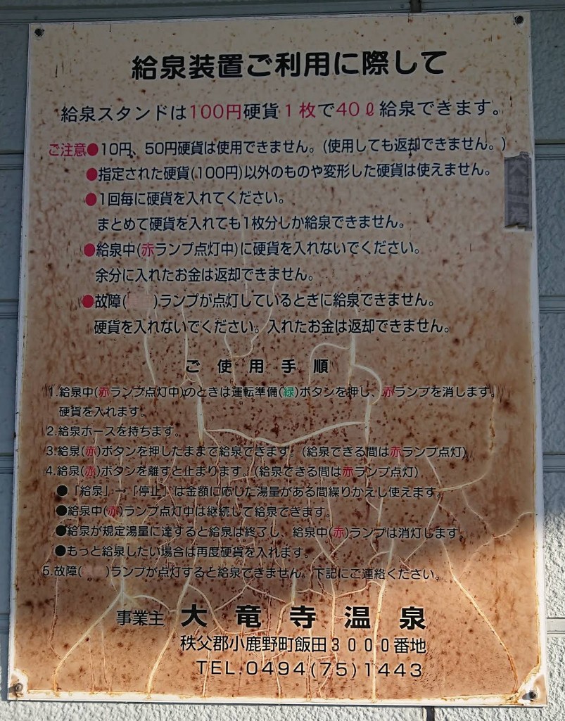 【大竜寺温泉スタンド】(埼玉県の水汲み場)秩父郡小鹿野町飯田 国道沿いの郵便局前にある 汲みやすい温泉スタンド 40リットル100円 [名称] 大竜寺温泉スタンド [場所] 埼玉県秩父郡小鹿野町飯田2701−1 [言い伝え・概要] 国道299号線沿いの三田川郵便局の斜め向かいにある温泉スタンド。 無色澄明無味無臭 源泉名 大竜寺温泉 泉質 温泉法第2条のメタほう酸(HBO2)の項で温泉法の温泉に適応 利用時間 24時間 年中無休 料金 40リットル 100円 [保全活動] [Google クチコミ] こちら お気に入りに追加※自然の湧水は煮沸して飲用されるとより安全です。※水辺は水難や危険生物に十分気を付けてください。 Click to share on X (新しいウィンドウで開きます) X このエントリーをLINEで送る (新しいウィンドウで開きます) LINEに送る Facebook で共有するにはクリックしてください (新しいウィンドウで開きます) Facebook このエントリーをはてなブックマークに追加 (新しいウィンドウで開きます) はてなブックマーク (場所)温泉スタンド 小鹿野町 | 関東 | 埼玉県 | 秩父郡 投稿日: 2026年1月27日 投稿者: Sumai事務局