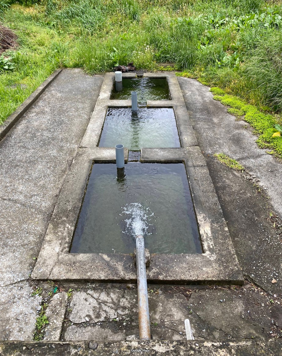 【御前水】青森県八戸市鮫町下松苗場 蕪島海浜公園近く・線路脇の窪地 3段水槽に注がれる貴重な湧き水