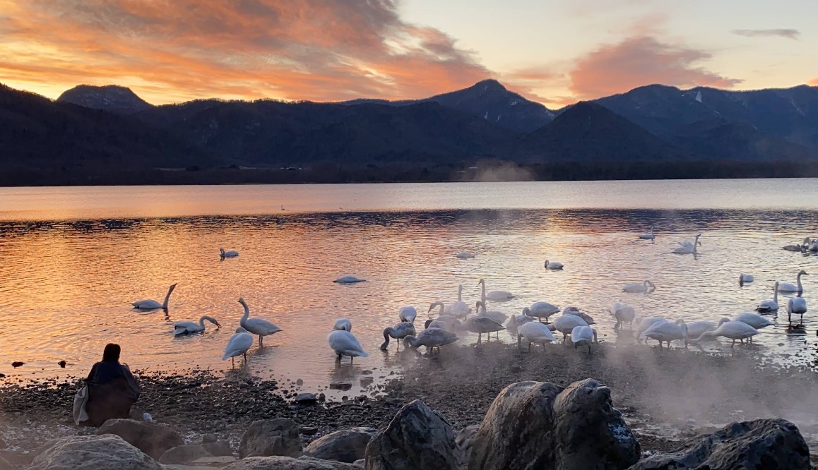 【コタン温泉露天風呂】(北海道の水場)川上郡弟子屈町屈斜路古丹 夕日が美しく映える 湖面すれすれに設置された無料露天風呂