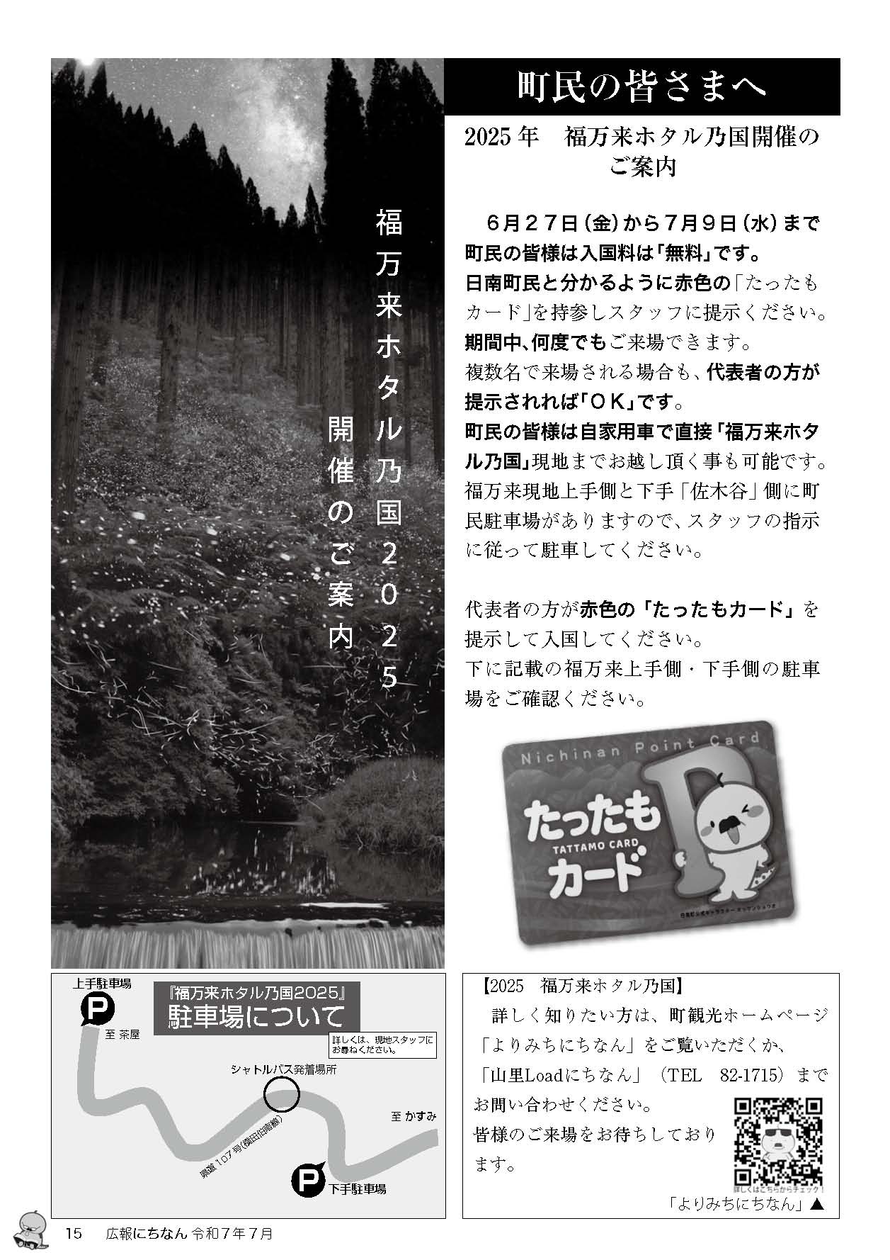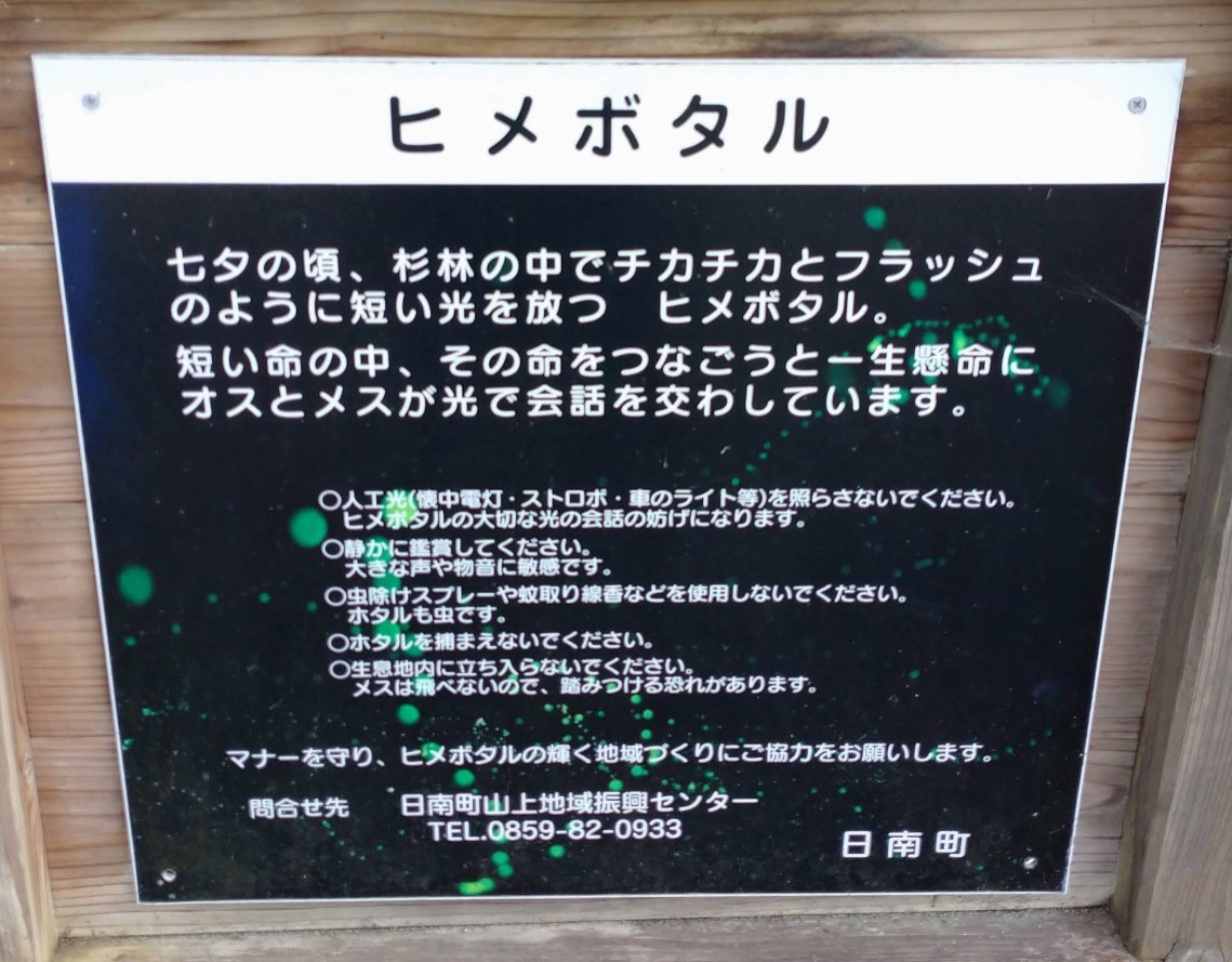 【福万来ホタル乃国】(鳥取県の水辺)日野郡日南町福万来 2万匹のヒメボタルとゲンジボタルが同時に舞う 優雅な光の大饗宴 [名称] 福万来ホタル乃国 [場所] 鳥取県日野郡日南町福万来 [言い伝え・概要] 福万来は、ヒメボタルとゲンジボタルが同時かつ大規模に見られる全国でも珍しいホタル観賞地。 福万来のホタルは全て野生のホタルで、この地に生息している約2万匹のヒメボタルと川の上を優雅に舞うゲンジボタルの光の大饗宴を見る事ができる。 入国料金必要。2025年は、1,000円 高校生500円 (中学生無料) [保全活動] [Google クチコミ] こちら 出典 よりみちにちなん 日南町(PDF) お気に入りに追加※自然の湧水は煮沸して飲用されるとより安全です。※水辺は水難や危険生物に十分気を付けてください。 Share on X (新しいウィンドウで開きます) X このエントリーをLINEで送る (新しいウィンドウで開きます) LINEに送る Share on Facebook (新しいウィンドウで開きます) Facebook このエントリーをはてなブックマークに追加 (新しいウィンドウで開きます) はてなブックマーク (自然)ゲンジボタル | (自然)ヒメボタル | (自然)ホタルの里 日南町 | 鳥取県 | 日野郡 | 中国 投稿日: 2026年4月9日 投稿者: Sumai事務局