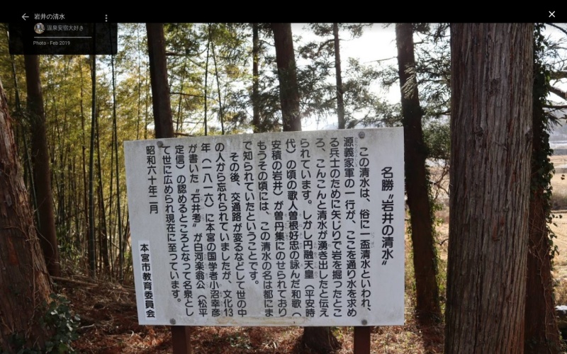 【岩井の清水】(福島県の湧水)本宮市青田字岩井 源義家の矢じりで湧き出たという伝説の清水 [湧水の名称] 岩井の清水(いわいのしみず) [場所] 福島県本宮市青田字岩井 [言い伝え・概要] 源義家軍の一行が水を求める兵士たちのために矢じりによって岩を掘ったところ清水が湧いたという伝説の湧水 [保全活動] 年2回程度地元町内会が草刈等の美化活動を行っている。 [Google クチコミ] こちら 出典 環境省ホームページ お気に入りに追加※自然の湧水は煮沸して飲用されるとより安全です。※水辺は水難や危険生物に十分気を付けてください。 Click to share on X (新しいウィンドウで開きます) X このエントリーをLINEで送る (新しいウィンドウで開きます) LINEに送る Facebook で共有するにはクリックしてください (新しいウィンドウで開きます) Facebook このエントリーをはてなブックマークに追加 (新しいウィンドウで開きます) はてなブックマーク (人物)源義家 東北 | 福島県 | 本宮市 投稿日: 2021年4月6日2023年6月20日 投稿者: Sumai事務局