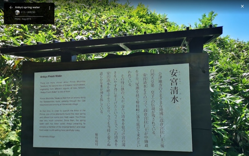 【安宮清水】(福島県の湧水)南会津郡檜枝岐村下ノ台 平安時代、以仁王に献上された清らかな水 [湧水の名称] 安宮清水(あんきゅうしみず) [場所] 福島県南会津郡檜枝岐村下ノ台353 [言い伝え・概要] 高倉宮以仁王が中仙道を下り檜枝岐に落ち延びて来たと言われている。 その時に供の一人が冷たい清水を見つけ宮の渇きをいやす為に差し上げたということで「安宮清水」と呼ぶようになった。 [保全活動] [Google クチコミ] こちら 出典 環境省ホームページ お気に入りに追加※自然の湧水は煮沸して飲用されるとより安全です。※水辺は水難や危険生物に十分気を付けてください。 Click to share on X (新しいウィンドウで開きます) X このエントリーをLINEで送る (新しいウィンドウで開きます) LINEに送る Facebook で共有するにはクリックしてください (新しいウィンドウで開きます) Facebook このエントリーをはてなブックマークに追加 (新しいウィンドウで開きます) はてなブックマーク (人物)以仁王 東北 | 桧枝岐村 | 南会津郡 | 福島県 投稿日: 2021年4月6日2023年6月20日 投稿者: Sumai事務局