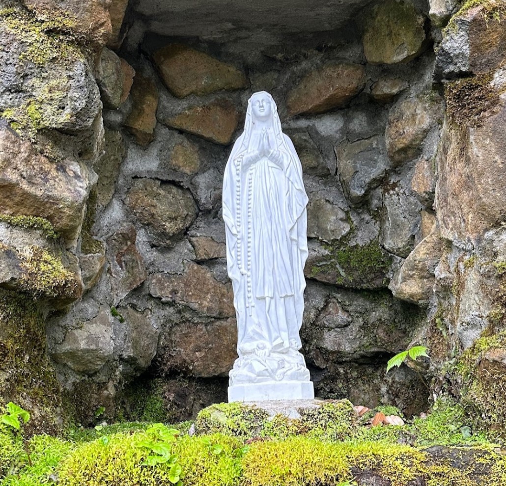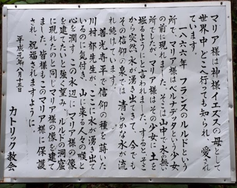 1866年、フランスの洞窟ルルドで聖女ベルナデッタの前に現れた聖母マリアと同じ像。世界でも有名なルルドの水は大病患者を治癒したりといった不思議な効能で知られています。 この湧水は、信仰の種を蒔いた川村郁氏により発見された清水で、氏の要望により同じく水辺のこの地に聖母マリア像が建てられ、人々の喉と心を潤している。 |