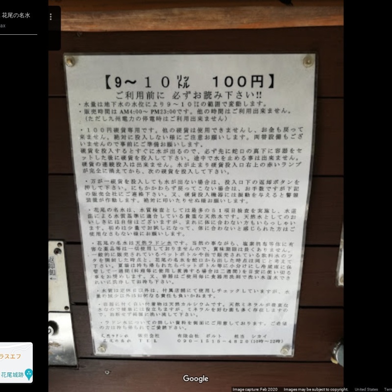 [言い伝え・概要] “10リットル100円。100円硬貨専用の無人販売店です。両替設備はありませんので必ず持参して下さい。容器も必ず持参して下さい。レストランバープラスエフの駐車場をご利用出来ます。駐車場横に天然水販売所は隣接されてます。道に迷いましたら09015154820にお電話下さい。”