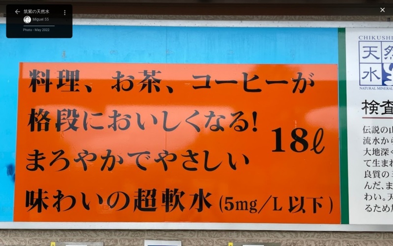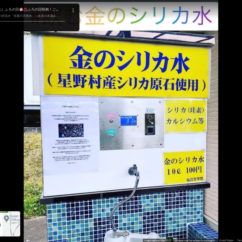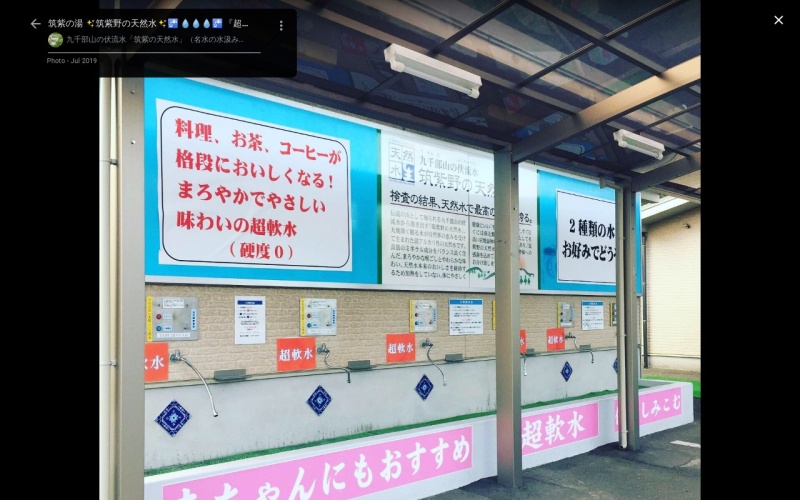 料金:水は無料 設備維持管理費100円「超軟水」と「中硬水」と「飲む金のシリカ水」すぐ近くには商売繁盛・開運の神様として名高い宮地獄神社ゆかりの神社もあり、「筑紫の天然水」の地の恵みと皆様への感謝を込めて多福をお分け致します。 超軟水硬水からあえてカルシウムとマグネシウムを除去することでまろやかさが増しており、お茶や珈琲、お料理が更に美味しくなること請け合いです。 中硬水良質のミネラル成分をバランス良く含んだ、喉ごしのよいやわらかな味わい。天然水本来のおいしさを維持するため加熱をしていない、体にやさしく健康にいい「生きている水」です。 「飲む金のシリカ水」ミネラルの一種である「ケイ素(シリカ」を含んでいる水がシリカ水です。ケイ素はビューティーミネラルとも言われ、美容にも健康にも期待できる効果が沢山あります。星野一帯の水は鉱物から溶け出したミネラルが多く含む、銀の鉱物は殺菌作用があり、金は水の味をまろやかにさせる効果があります。 『筑紫の天然水』取水について