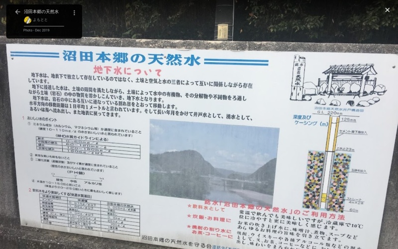 飲料水として常温で飲んでも美味しいですが、冷蔵庫で10℃位に冷やすとさらに美味しく感じます。 炊飯・お料理にお米の炊き上げ水に、煮物、ス-プなど、あらゆるお料理の旨味を引き立てます。 焼酎の割り水に お茶・コーヒーに焼酎、ウイスキーや各種アルコール類などの割水として、又、お茶、コーヒーなどに、美味しさを引き出し、味わいをまろやかにします。 (看板より引用) |