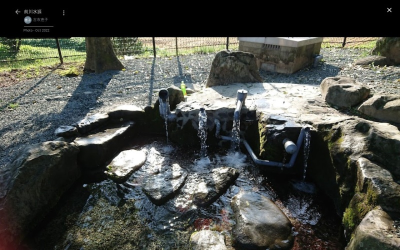 [言い伝え・概要] 水車が回る風情豊かな前川公園の水汲み場で、勢いよく噴出している湧水。
