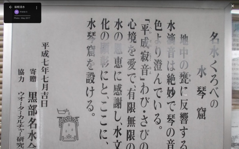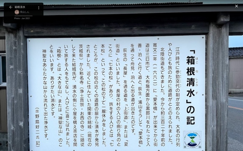 【箱根清水】(富山県の湧水)黒部市長屋 水琴窟の甕もある 江戸時代から旅人の喉を潤してきた 七本松の下の湧水 [湧水の名称] 箱根清水(はこねしょうず) [場所] 富山県黒部市長屋 [言い伝え・概要] 「箱根」とは「大きな山」、または「神聖な山」のことをいいます。 神聖なあらたかな山から流れ出た浄水。 江戸時代に北陸街道を行き来した旅人ののどを潤した休憩所を復元しており、水琴窟の音色を聞くことができる。人々の身心を潤す憩いの場となっている。 [保全活動] 黒部名水会 [Google クチコミ] こちら 出典 箱根の清水 お気に入りに追加※自然の湧水は煮沸して飲用されるとより安全です。※水辺は水難や危険生物に十分気を付けてください。 Click to share on X (新しいウィンドウで開きます) X このエントリーをLINEで送る (新しいウィンドウで開きます) LINEに送る Facebook で共有するにはクリックしてください (新しいウィンドウで開きます) Facebook このエントリーをはてなブックマークに追加 (新しいウィンドウで開きます) はてなブックマーク (場所)水琴窟 中部 | 富山県 | 黒部市 投稿日: 2021年5月23日2023年6月21日 投稿者: Sumai事務局