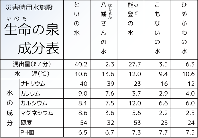 | [言い伝え・概要] | 町内5ヶ所の「生命の泉」は、以前から地域の皆さんが活用していた自然湧水を、北海道南西沖地震を教訓に災害時の貴重な給水施設として整備したものです。