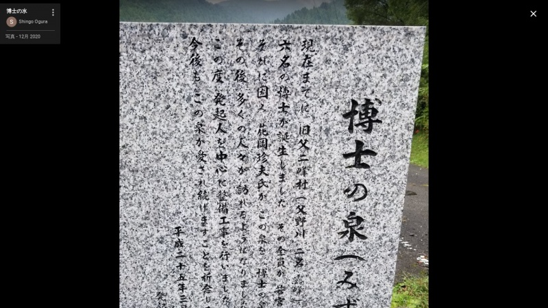 | [言い伝え・概要] | 久万高原町露峰地区にある水で、この地区からその昔7名の博士号取得者が出ており、この水を飲めば頭が良くなると言われています。(博士号取得者の名前は、久万高原町立父二峰小学校にある石碑の裏側に書かれています。)「博士の水」という名称は、当時の文化財保護員さんが名付けました。