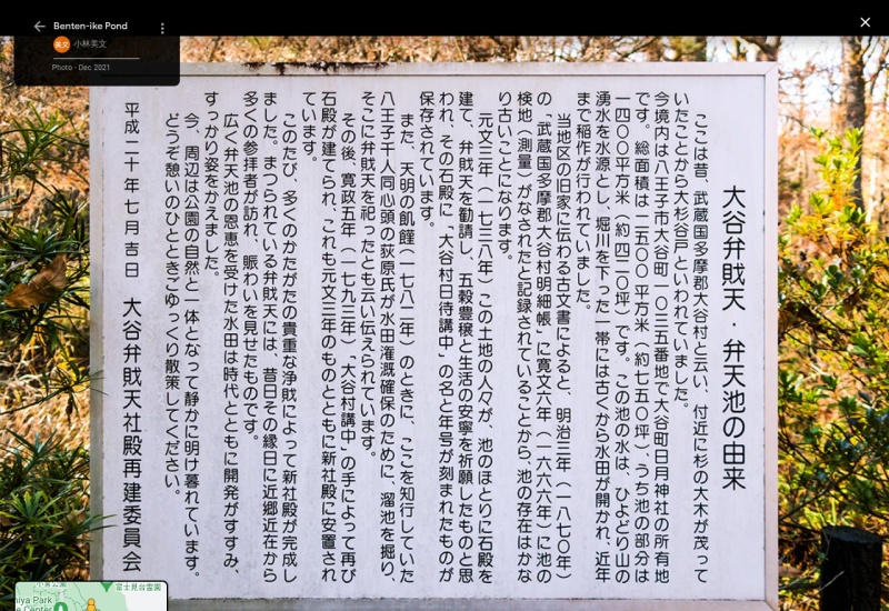 【小宮公園・大谷弁天池】(東京の名湧水57選)東京都八王子市暁町 丘の上の大谷沢から引水されている 雑木林の中にある湧水池 [湧水の名称] 小宮公園(こみやこうえん)大谷弁天池 [場所] 東京都八王子市暁町2丁目41−6 [言い伝え・概要] 「谷頭タイプ」の湧水で、公園内北西側から湧出している。湧水は、雑木林の谷間を流れる大谷沢を通って、一部が大谷弁天池に流れ込んでいる。 「崖線タイプ」と「谷頭」タイプ 東京の名湧水57選に選定。 [保全活動] [Google クチコミ] こちら 出典 環境省ホームページ お気に入りに追加※自然の湧水は煮沸して飲用されるとより安全です。※水辺は水難や危険生物に十分気を付けてください。 Click to share on X (新しいウィンドウで開きます) X このエントリーをLINEで送る (新しいウィンドウで開きます) LINEに送る Facebook で共有するにはクリックしてください (新しいウィンドウで開きます) Facebook このエントリーをはてなブックマークに追加 (新しいウィンドウで開きます) はてなブックマーク (名水・名勝)東京の名湧水57選 関東 | 八王子市 | 東京都 投稿日: 2021年7月7日2023年6月19日 投稿者: Sumai事務局