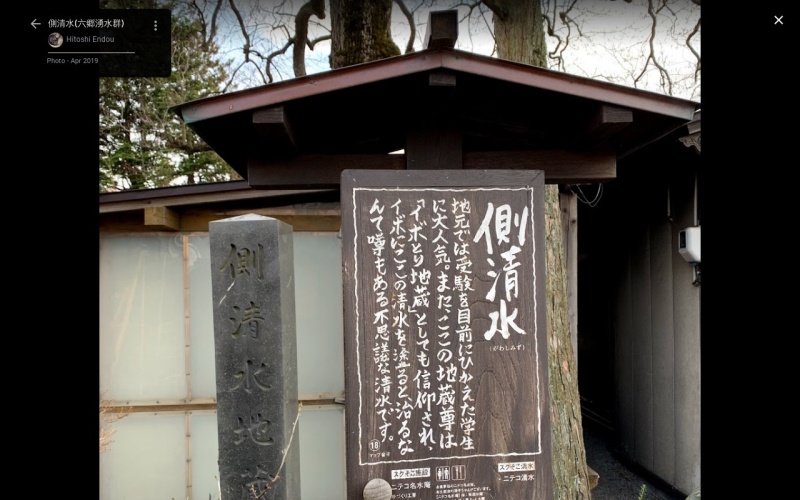 この側清水地蔵尊のそばに清水が湧いて俗称『側清水』というが、 この場合、文頭に『がわ』と濁るのは古代文法に背いており疑義が 菅江真澄『月の出羽路・仙北郡六郷町高野(似手児の清水)』の 地蔵尊は、イボとり地蔵として信仰されている。