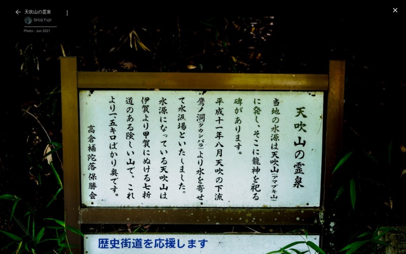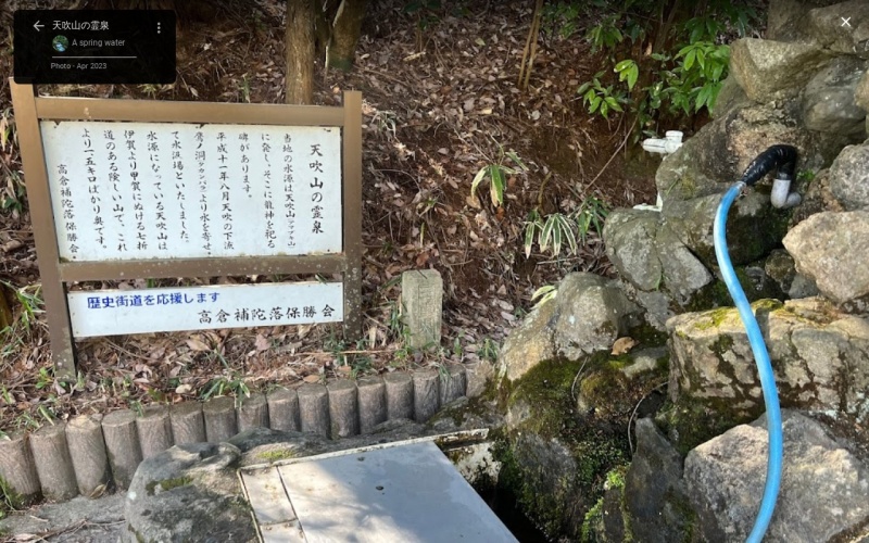 [言い伝え・概要] 伊賀より甲賀に抜ける七折道のある険しい天吹山の下流鷹ノ洞(タカンバラ)より平成11年8月、水を引いて造られた水汲み場。