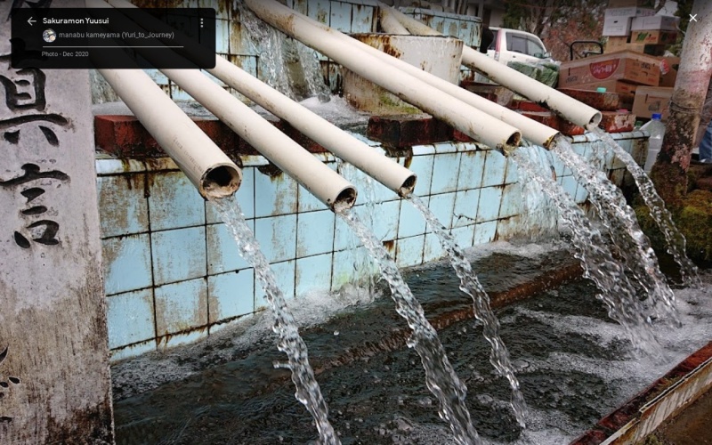 【桜門湧水】(長崎県の湧水)島原市桜門町 スーパー脇・竹筒やカエル像から湧き出る 程よいミネラルの美味しい水
