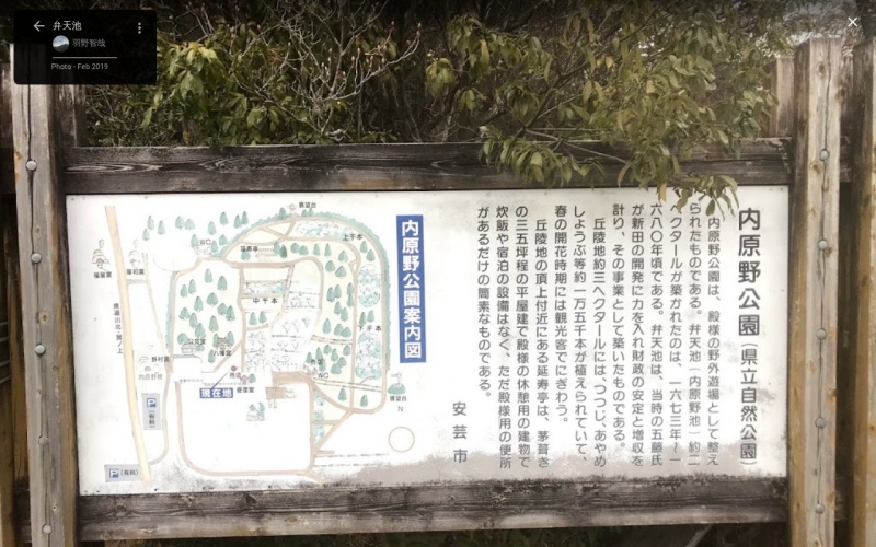 弁天池(内原野池)約2ヘクタールが築かれたのは1673~1680年頃である。 弁天池は、当時の五藤氏が新田の開発に力を入れ、財政の安定と増収を計りその事業として築いたものである。 丘陵地3ヘクタールには、つつじ、あやめ、しょうぶ等約15000本が植えられて、春の開花時期には、観光客でにぎわう。 (現地掲示板より) |