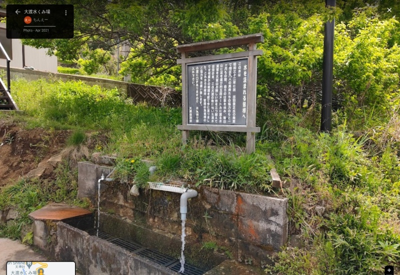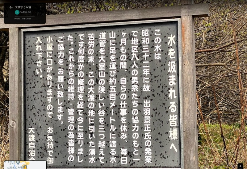 [言い伝え・概要] この水は昭和32年に故出羽景正氏の発案で地区9人の男衆たちの協力のもと1ヶ月もの間自らの仕事を休み、毎日山に足を運び、約500メートルに渡る水道管を大室山の険しい谷を3つ越えて、苦労の末この大渡の地に引いた湧水です。
