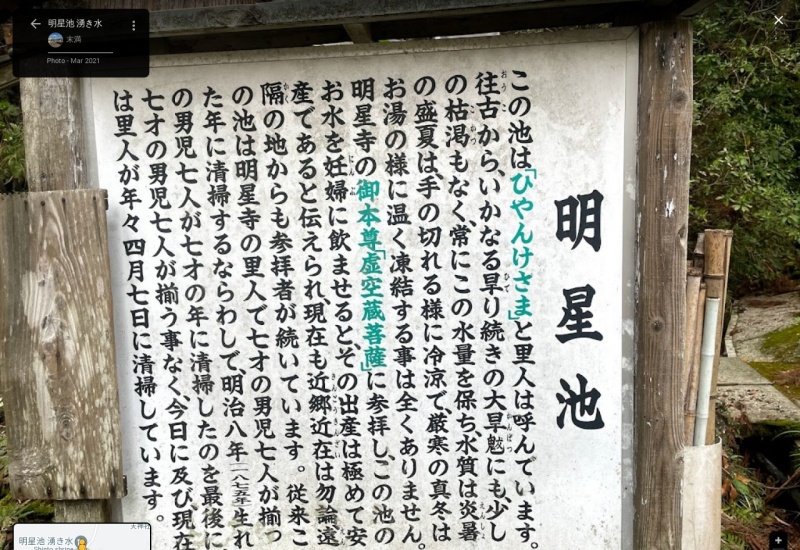 | [言い伝え・概要] | 里人から「ひやんけさま」と呼ばれるこの池は、夏は手が切れるように冷たく、冬はお湯のように暖かく、古より涸れた事がないと言われている。