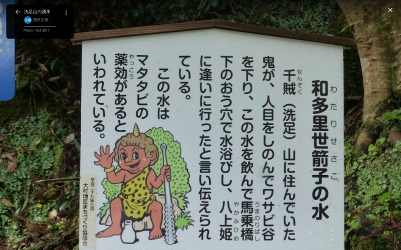 [言い伝え・概要] 用瀬町赤波のおう穴群を形成する花崗岩から湧きだす湧水で、延命水(和多里世箭子の水)といわれ、洗足山(千賊山)に住んでいた鬼が、日中人目をしのび、この谷の水を飲み、馬乗橋の下のおう穴で水浴し、八上姫(河原町)に逢いに行ったという伝説のある湧水。