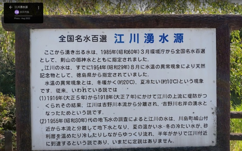 【江川湧水源】(徳島県の湧水・日本の名水百選)吉野川市鴨島町西麻植 県の天然記念物に指定された 冬暖かく夏冷たい湧水