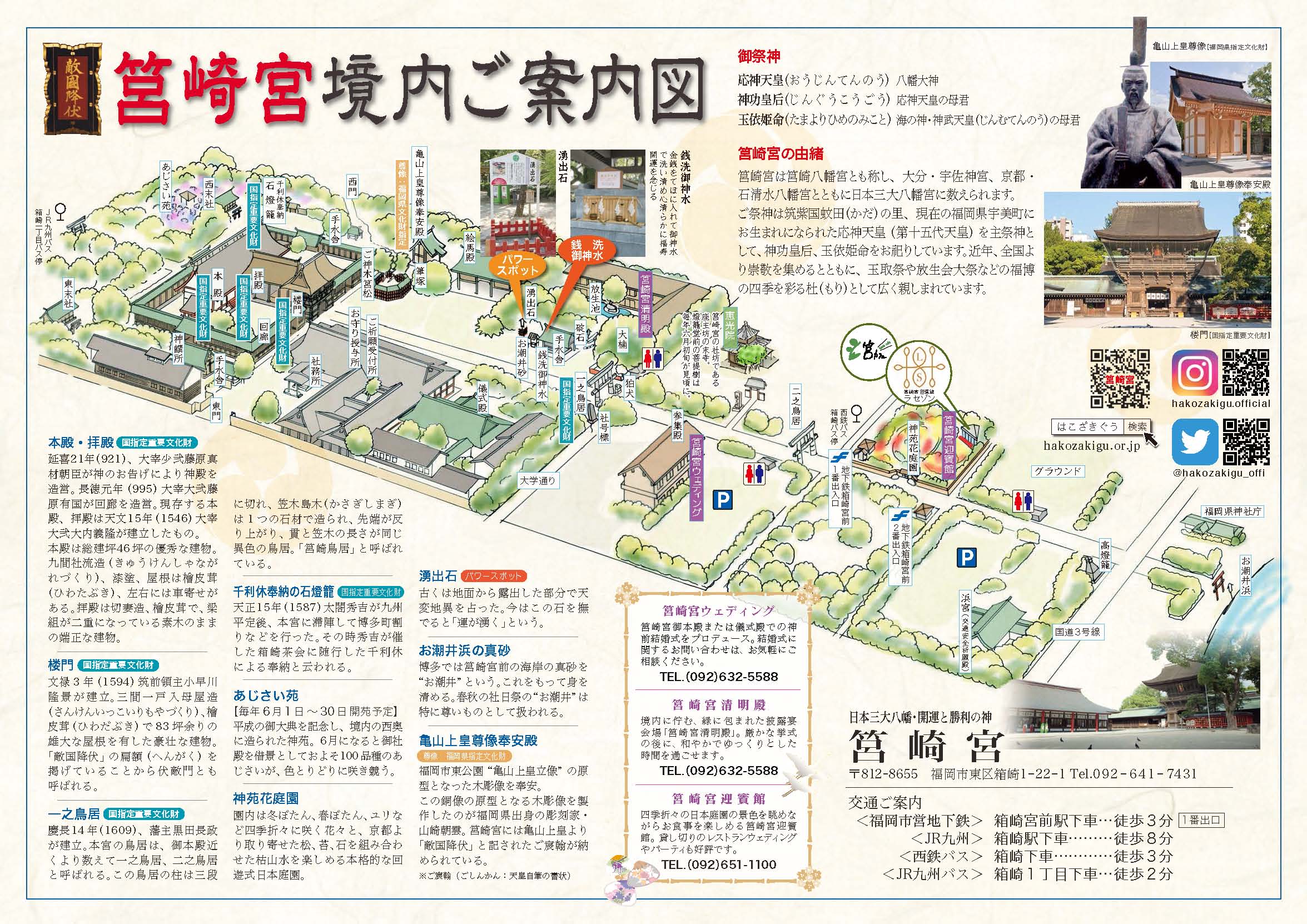 | [言い伝え・概要] | 日本三大八幡宮の筥崎宮(箱崎八幡宮)は、筑紫国蚊田(かだ)の里、現在の福岡県宇美町にお生まれになられた応神天皇(第十五代天皇)を主祭神として、神功皇后、玉依姫命をお祀りしています。
