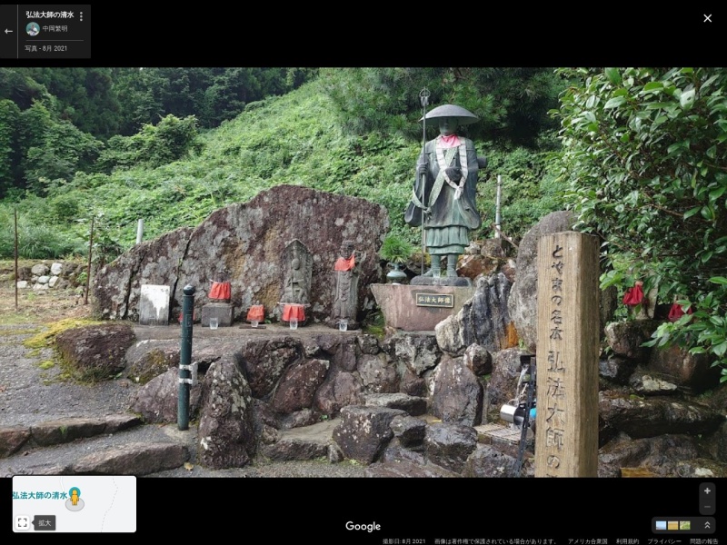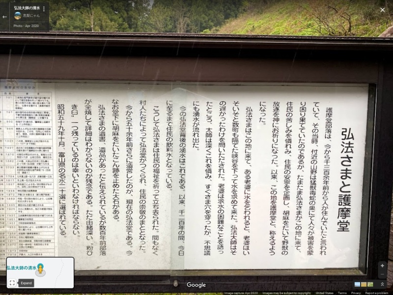 地名の由来は、弘法大師が村民の幸せを祈って護摩をたいたことによるものとされている。 この高台に湧く清水は、地元の人びとに「頭が良くなる弘法清水」といわれ、現在でも、大切に保存されている。 とやまの名水二十選に選定されている。 |