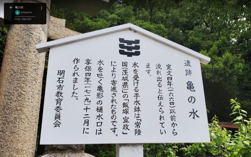 【亀の水】(兵庫県の湧水)明石市人丸町 播磨三名水の霊泉 三百年前の亀形から出る長寿の水 [湧水の名称] 亀の水(かめのみず) [場所] 兵庫県明石市人丸町5−1 [言い伝え・概要] 柿丸神社の西参道にあり、神社南門の手水鉢として設けられた。 人丸山から湧き出た霊泉で、播磨三名水のひとつであり、かって「長寿の水」とも言われていた。 現在も名水を求め多くの人々が訪れている。 [保全活動] [Google クチコミ] こちら 出典 環境省ホームページ お気に入りに追加※自然の湧水は煮沸して飲用されるとより安全です。※水辺は水難や危険生物に十分気を付けてください。 Click to share on X (新しいウィンドウで開きます) X このエントリーをLINEで送る (新しいウィンドウで開きます) LINEに送る Facebook で共有するにはクリックしてください (新しいウィンドウで開きます) Facebook このエントリーをはてなブックマークに追加 (新しいウィンドウで開きます) はてなブックマーク (パワースポット)霊泉 近畿 | 兵庫県 | 明石市 投稿日: 2021年3月2日2023年6月21日 投稿者: Sumai事務局