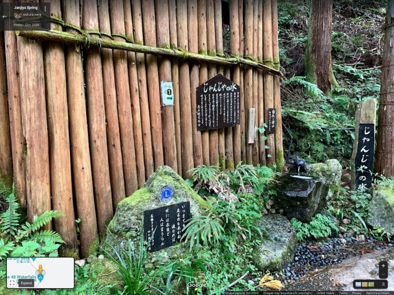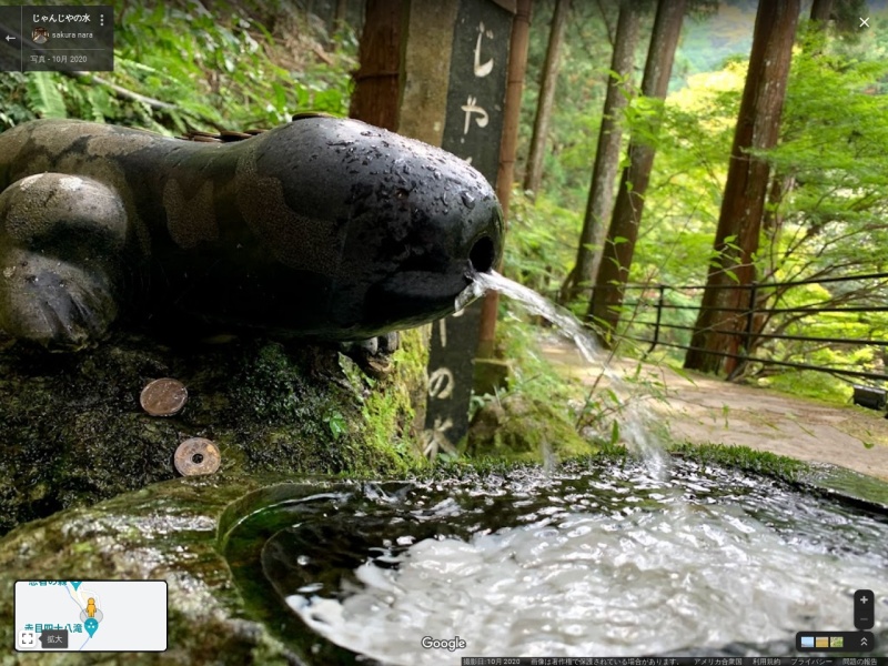 岩場の上のサンショウウオの形をした造形物から流れている。 水がじゃんじゃん出る事と、行者の持つ錫杖の音(じゃんじゃん)に似ている事から「じゃんじゃの水」と命名された。 古の伊賀忍者が修行の際にこの水で身を清めたとされ、心を清め幸せを呼ぶ水と伝えられている。 |