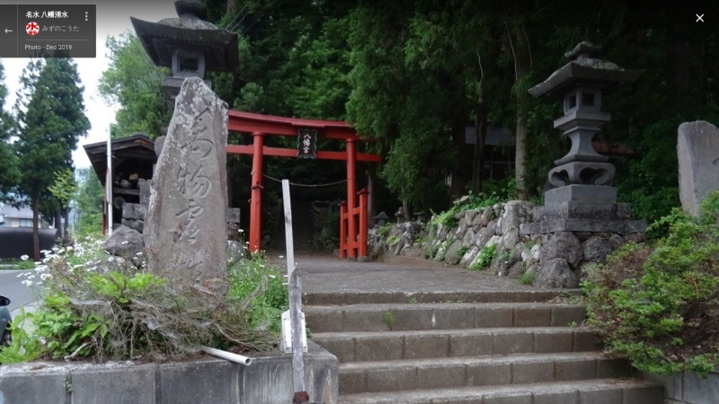 野沢温泉村の中尾地区に八幡神社(武の神、戦闘の神、出世か開運の神といわれる)がありますが、鳥居がある入口のすぐ脇に清水があります。この水は、この地で仕込まれるどぶろくの仕込み水としても使用されています。 この神社裏手から少し離れた場所にも清水があります。