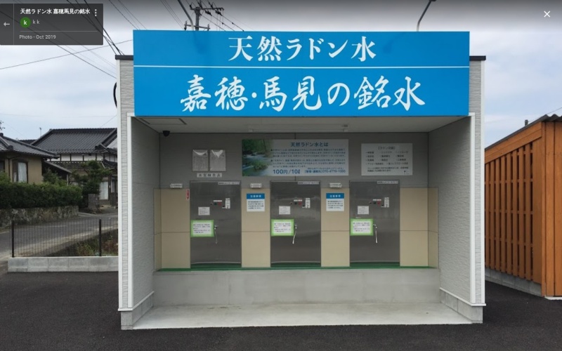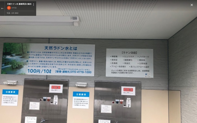 神経痛・リュウマチ・ノイローゼ・夜尿症・動脈硬化・糖尿病・皮膚病・高血圧・公害喘息・アトピー性皮膚炎・高コレステロール血症に効くと看板に掲載されています。 天然ラドンやミネラルを含む軟水の「天然ラドン水」で飲みやすいのも特徴です。 100円で10リットル。 |