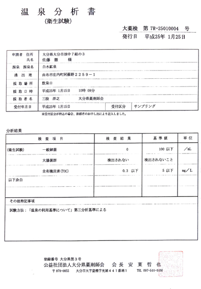 湧水時、ミネラルウォーター水質基準に適合する良質の水として広く、天下に知られることろとなっております。 無色透明、無臭で、人間の命に大切なミネラル、含有成分が多量に含まれております。昔から人々に健康の水として親しまれ、喜ばれております。
