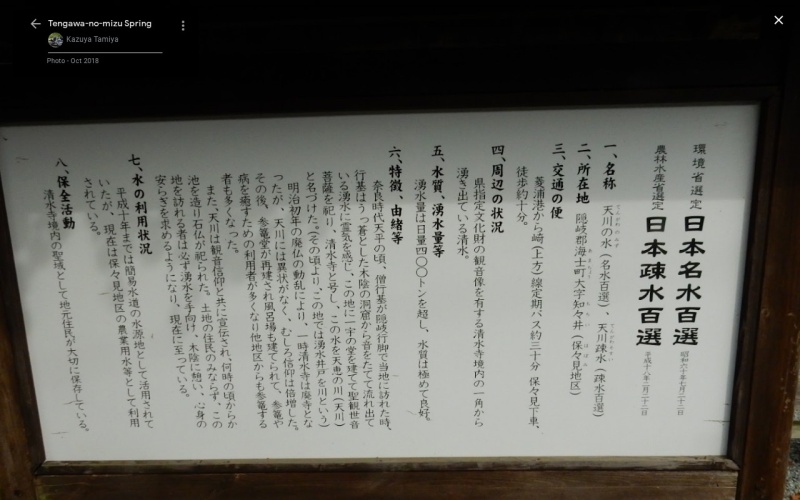 【天川の水】(島根県の湧水・日本の名水百選)隠岐郡海士町知々井 奈良時代に清水寺・天恵の川と名付けられた 透明で極めて水質良好な清水 [湧水の名称] 天川の水(てんがわのみず) [場所] 島根県隠岐郡海士町知々井 [言い伝え・概要] 水の透明度と水質のよさが評判で日本名水百選に選ばれている。 一年を通して湧き水は絶えることなく稲作が盛んに行なわれている。 水の持ち帰りは自由です。 [保全活動] 保々見区(自治会)の活動の一環として、毎月1回清水寺「天川の水」周辺の清掃を実施している。 [Google クチコミ] こちら 出典 環境省ホームページ お気に入りに追加※自然の湧水は煮沸して飲用されるとより安全です。※水辺は水難や危険生物に十分気を付けてください。 Click to share on X (新しいウィンドウで開きます) X このエントリーをLINEで送る (新しいウィンドウで開きます) LINEに送る Facebook で共有するにはクリックしてください (新しいウィンドウで開きます) Facebook このエントリーをはてなブックマークに追加 (新しいウィンドウで開きます) はてなブックマーク (名水・名勝)昭和の名水百選 | (名水・名勝)日本の名水百選 海士町 | 島根県 | 隠岐郡 投稿日: 2021年3月5日2023年8月8日 投稿者: Sumai事務局