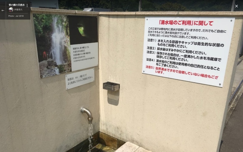 天山山系からの豊富な湧水が、飲料製造業、株式会社友桝飲料の工場内から湧き出ていて、同社のナチュラルミネラルウォーターに使われている。 地下152mから湧水が自噴していて、工場見学後に立ち寄った人々も利用しているという。 |