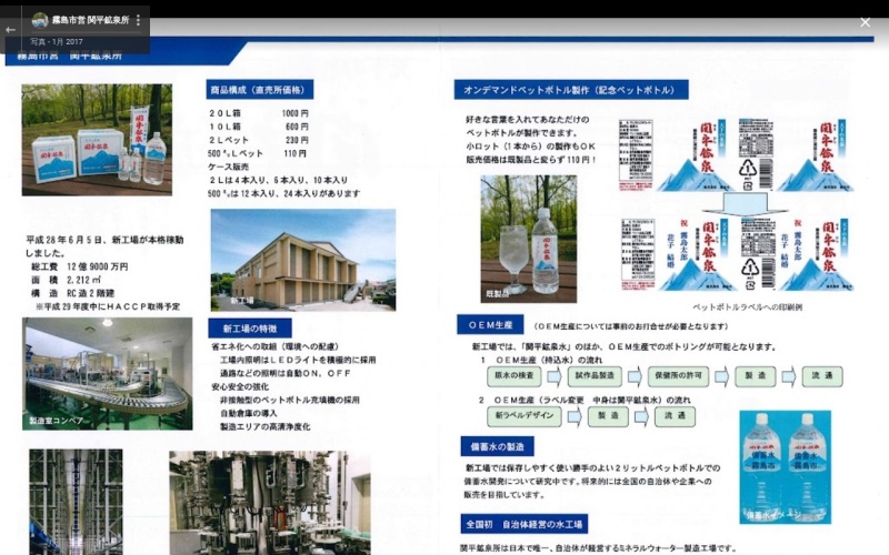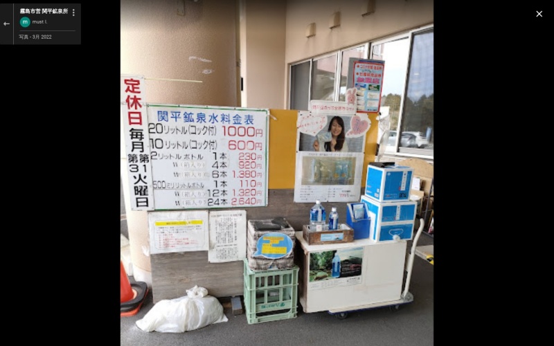 カルシウム・マグネシウムなどのミネラルが適量含まれた中硬水。 ドライブスルーも可能。 20リットル1000円