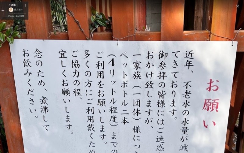 仲哀天皇・神功皇后に献上したとも伝えられる名水で、宰相であった武内宿禰が長寿で有名だったことから不老長寿の神徳があると伝えられている。 昭和60年7月日本の名水百選に認定。 |