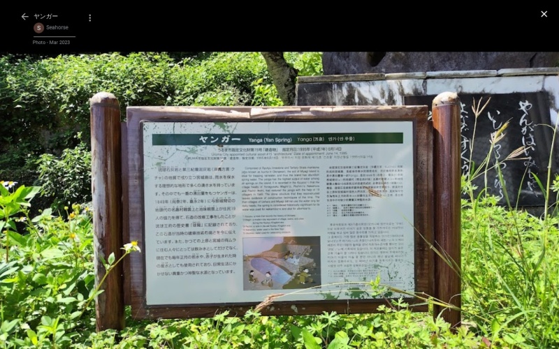 【ヤンガー】(沖縄県の湧水)うるま市与那城上原 市指定文化財 産湯・若水で使用された神聖な水源 [湧水の名称] ヤンガー(やんがー) [場所] うるま市与那城上原 [言い伝え・概要] 市指定文化財。 泉の内部はトンネル状に石を組み、涌き口まで続いているようである。 外観も石造建築の美を見事に調和させている。 昔は、産湯につかったことから「ウブガー」とも呼ばれている。 現在は、正月に清水をとる習わしがあり、地域の門中がヤンガーを拝み、健康祈願も行っている。 [保全活動] [Google クチコミ] こちら 出典 環境省ホームページ お気に入りに追加※自然の湧水は煮沸して飲用されるとより安全です。※水辺は水難や危険生物に十分気を付けてください。 Click to share on X (新しいウィンドウで開きます) X このエントリーをLINEで送る (新しいウィンドウで開きます) LINEに送る Facebook で共有するにはクリックしてください (新しいウィンドウで開きます) Facebook このエントリーをはてなブックマークに追加 (新しいウィンドウで開きます) はてなブックマーク (種類)産湯 | (名水・名勝)指定文化財 うるま市 | 九州 | 沖縄県 投稿日: 2021年3月8日2023年6月21日 投稿者: Sumai事務局