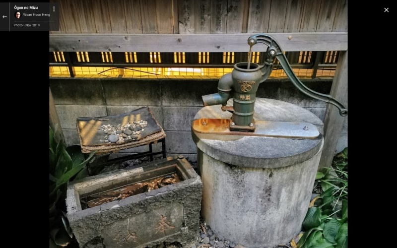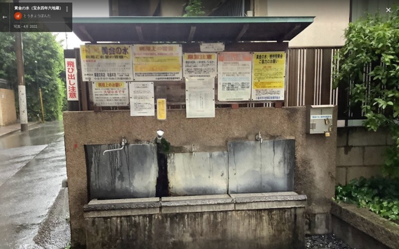 この井戸の水汲み場には、水栓のない蛇口があります。この蛇口の利用は登録制となっています。近くの「菊屋文具店」か「かごや書店」に登録料(500円)を支払えば誰でも「会員」になれます。会員は専用の水栓鍵を受け取り、8:00~20:00の時間帯であれば自由に良質でおいしい黄金の水を入手することができます。 試飲するためには、プッシュ式になっている「試飲用蛇口」からコップ1杯分の井戸水を無料で楽しむことができます。 |