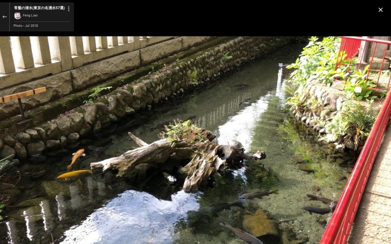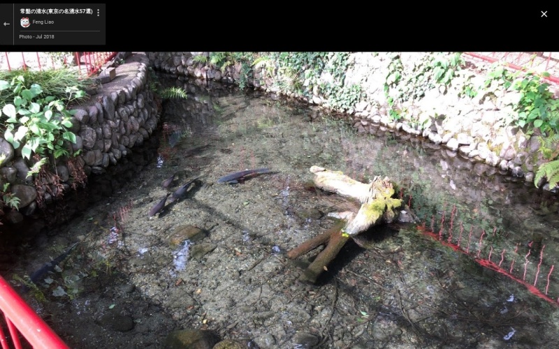 湧出量多く、厳島神社を祀る池はかなりの透明度。 池から出た多量の水は、神社の外の石垣に沿って流れる。 |