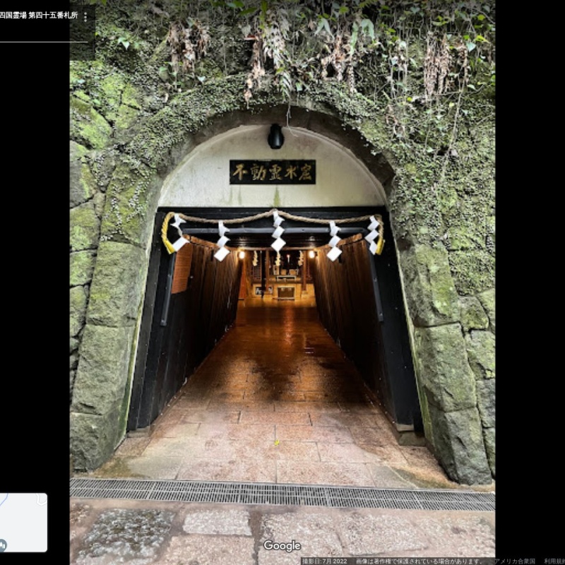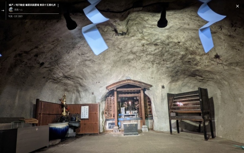 本堂の右には不動霊水窟があり、石を彫刻した不動明王が祀られている。