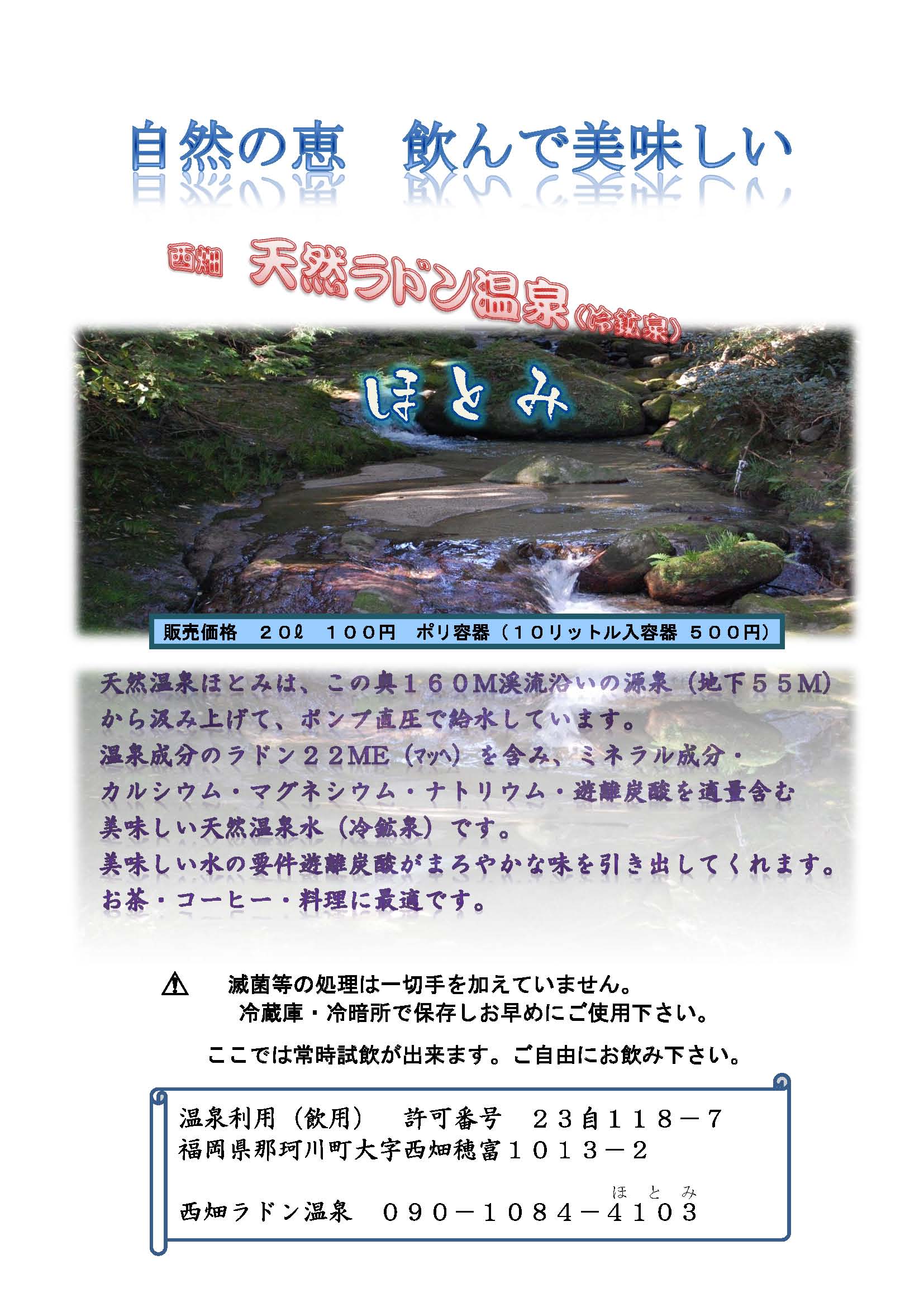 | [言い伝え・概要] | 天然温泉ほとみは、芋川160m渓流沿いの源泉(地下55m)から汲み上げて、ポンプ直圧で給水しています。