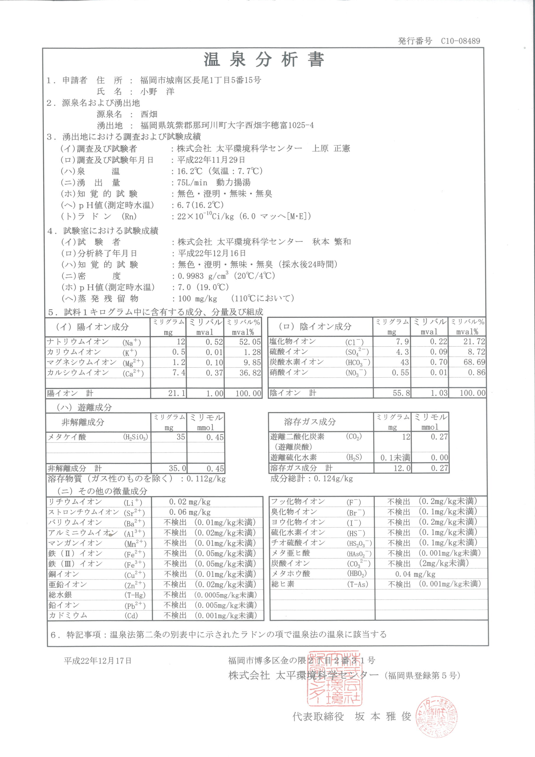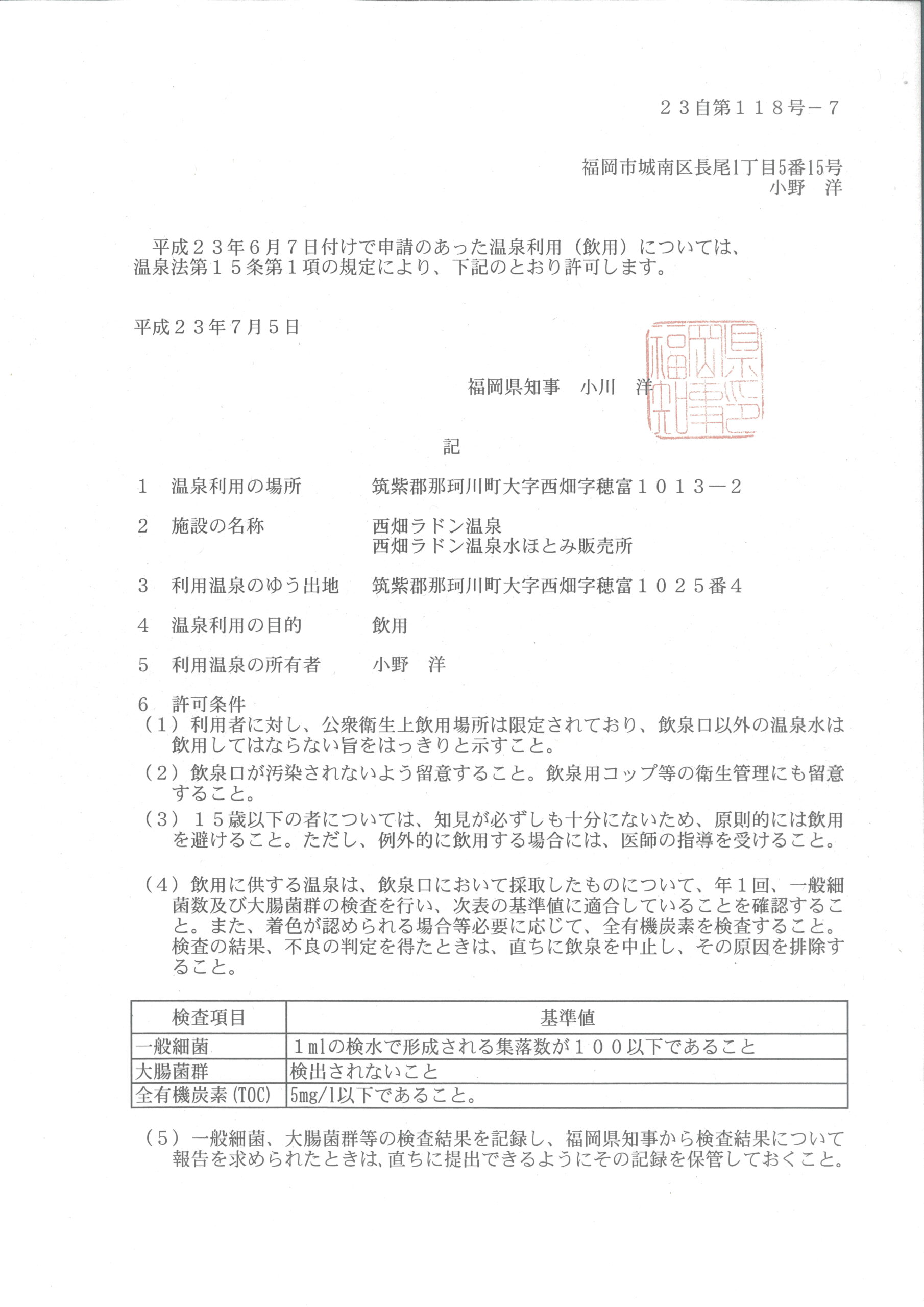 温泉成分のラドン6.0ME(マッヘ)を含み、ミネラル成分・カルシウム・マグネシウム・ナトリウム・遊離炭酸を適量含む美味しい天然温泉水(冷鉱泉)です。 美味しい水の要件遊離炭酸がまろやかな味を引き出してくれます。お茶・コーヒー・料理に最適です。 滅菌等の処理は一切手を加えていません。冷蔵庫・冷暗所で保存しお早めにご使用ください。 |
