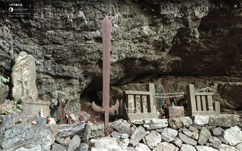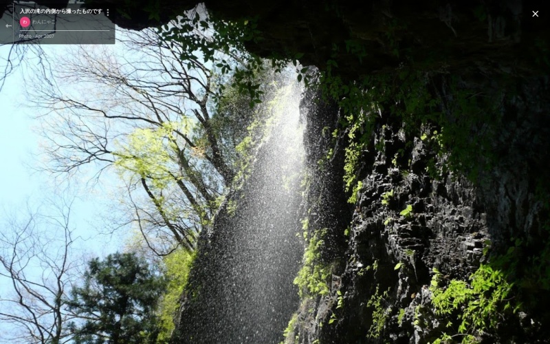 硬い岩盤のチャート層の上の地層から滝が流れ落ちてている。 上の地層の下部分が侵食され通行できるようになっていて、そこから滝の裏側を見る事ができる。 滝の奥の祠には不動明王が祀られていて、「体を削って飲めば、病が治る」との言い伝えがあり「身削り不動」と呼ばれている。 付近に数台の駐車場がある。 |