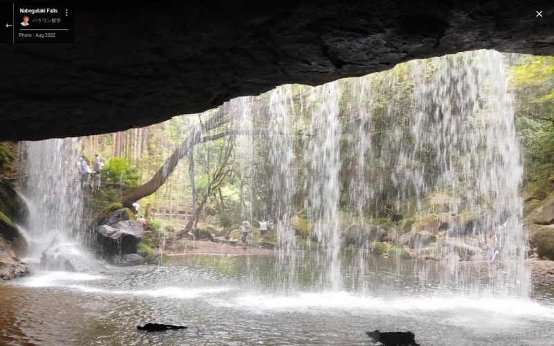 滝の落差は約10mと規模は小さいが、幅は約20mあり、カーテンのように幅広く落ちる水が木漏れ日に照らされる様子は、とても優美で神秘的。 滝上部の固い岩盤や滝裏のやわらかい地層は、今も浸食等を繰り返し、少しずつ形を変えている。 |