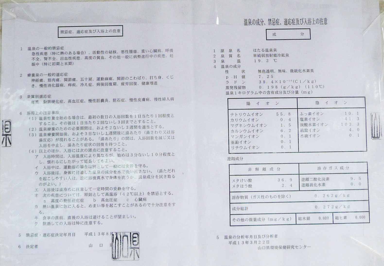 ラドン  38.4×10(-10乗) (Ci/kg)泉質別適応症 痛風・動脈硬化症・高血圧症・慢性胆嚢炎・胆石症・慢性皮膚病・慢性婦人病ホタル温泉ご利用の際の注意事項。●温泉泉は浴用水専用です。(飲用にはできません。)