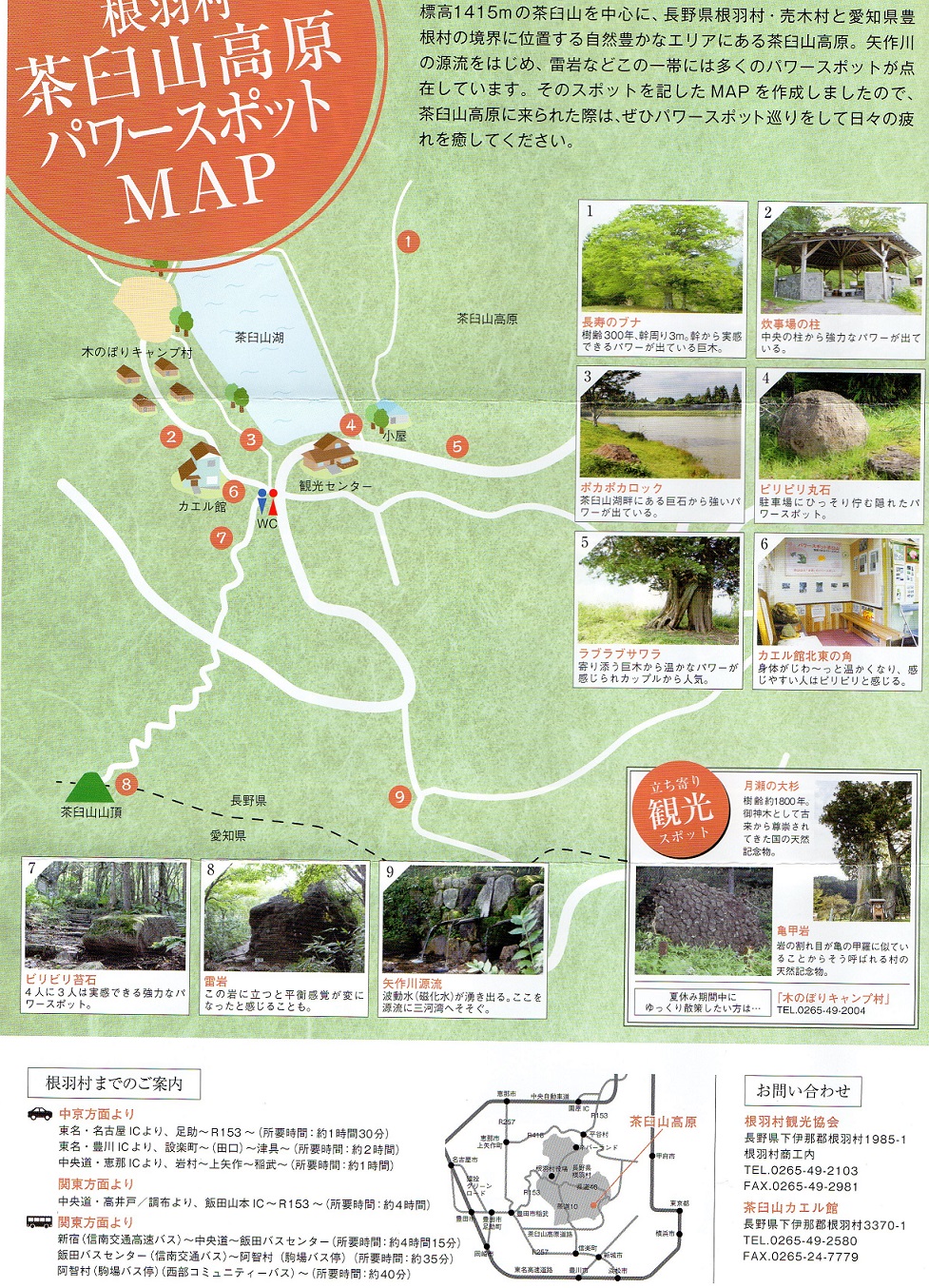 ゼロ磁場の波動水で「腐らない水」と言われている。 高原一帯には矢作川源流の他、雷岩、長寿のブナ、ポカポカブロック、ビリビリ丸石、ビリビリ苔石、ラブラブサワラ、炊事場の柱、カエル館北東の角など、数多くのパワースポットがある。 |