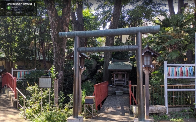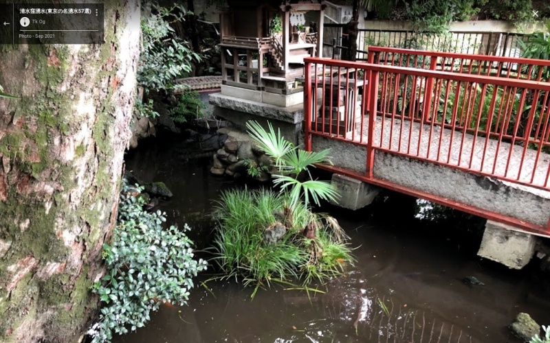 この湧水は武蔵野台地の端、千東の谷がつきるところにあり、旧村落の頃、この付近一帯を清水窪と呼んだのも、この地形のためである。 ここから湧き出る水は洗足池の源流となり、かつて千東の谷が田畑であった頃、用水として水田を灌漑していた。 本区のみならず東京都内に残された数少ない湧水池として貴重である。 (現地掲示板より) |