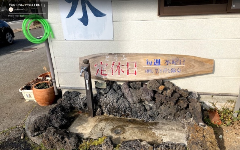 【角屋豆富店の水】(山梨県の水汲み場)南都留郡忍野村内野 エキス濃厚・のどこし良好な美味しい豆富を育む 富士山から湧き出る伏流水 [名称] 角屋豆富店の水 [場所] 山梨県南都留郡忍野村内野556 [言い伝え・概要] 名水の里・忍野村で、富士山からの湧き出てくる伏流水を使い、大豆エキスの濃い、食べた時にのどごしが良く美味しい豆富が食べられる「角屋豆富店」にある水汲み場。 店内に飲食スペース有。 [保全活動] [Google クチコミ] こちら 出典 角屋豆富店様ホームぺージ お気に入りに追加※自然の湧水は煮沸して飲用されるとより安全です。※水辺は水難や危険生物に十分気を付けてください。 Click to share on X (新しいウィンドウで開きます) X このエントリーをLINEで送る (新しいウィンドウで開きます) LINEに送る Facebook で共有するにはクリックしてください (新しいウィンドウで開きます) Facebook このエントリーをはてなブックマークに追加 (新しいウィンドウで開きます) はてなブックマーク (種類)伏流水 | (食事)豆腐 忍野村 | 山梨県 | 中部 | 南都留郡 投稿日: 2022年11月25日2023年8月1日 投稿者: Sumai事務局