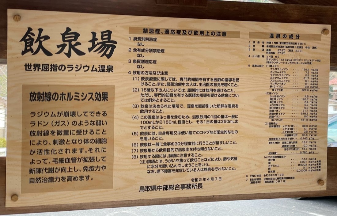 ラジウムが分解されて生じる弱い放射線を体に浴びると新陳代謝が活発になり、免疫力や自然治癒力を高めるホルミシス効果がある。 また、吸うこと、飲むことで抗酸化機能が高まり、老化や生活習慣病の予防に役立つ。 三朝温泉地区のがん死亡率は37年間の統計解析から全国平均の約1/2という。